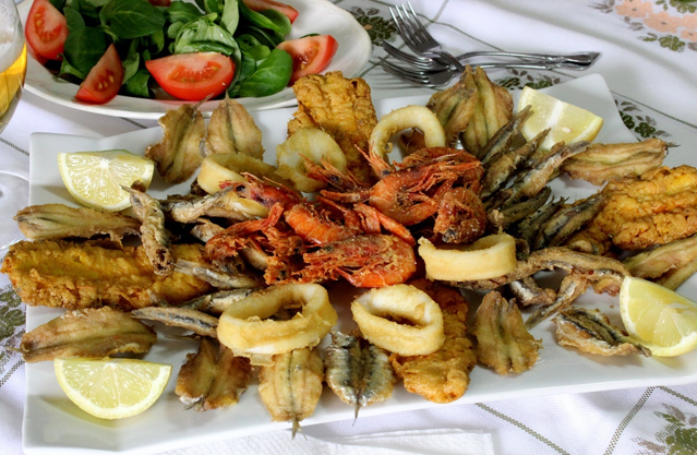 Tomatoes, green bell pepper, sliced cucumber onion, olives, and feta cheese.